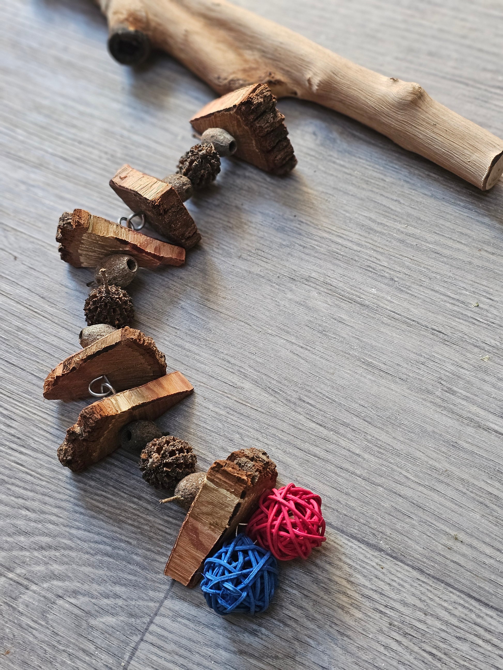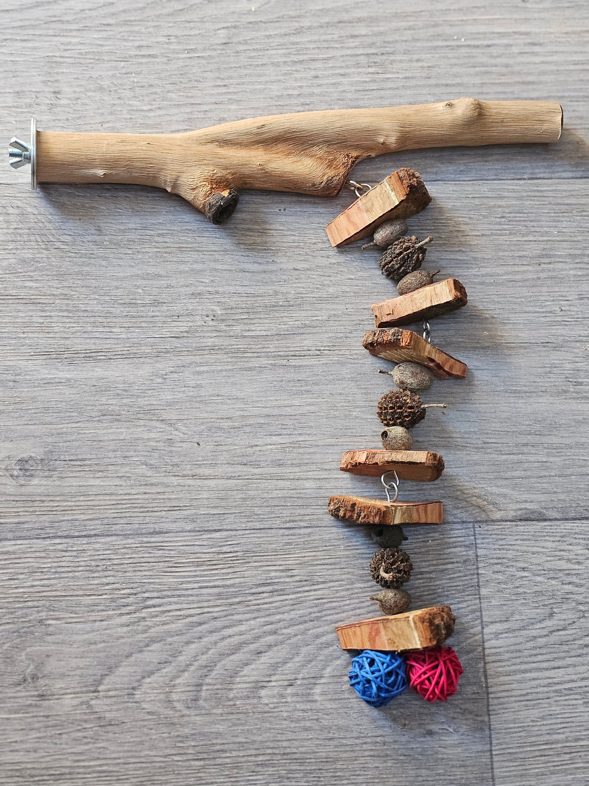 This spotted gum perch and toy is great to add to your birdies palace with it's all natural timber and fun toy feature, also perfect for your birdies feet and nails. Perch is made using spotted gum, zinc plate bolt, wing nut, 4cm washers and toy has been pieced together with gum nuts, casuarina nuts, gum pieces, casuarina bark, paper and stainless steel wire. Perch measures approximately 30cm long x 2cm thick diameter, toy dangling length is approximately 30cm 🐦🦜Suitable for small to medium birds (e.g. budgies, lovebirds, cockatiels, quakers, conures, ringnecks, caiques, eclectus, alexanderine, small macaws). Please note: I recommend when installing your birdies new perch that you install it with the hardware hanging externally where your feathered friend cannot play with it 🪶