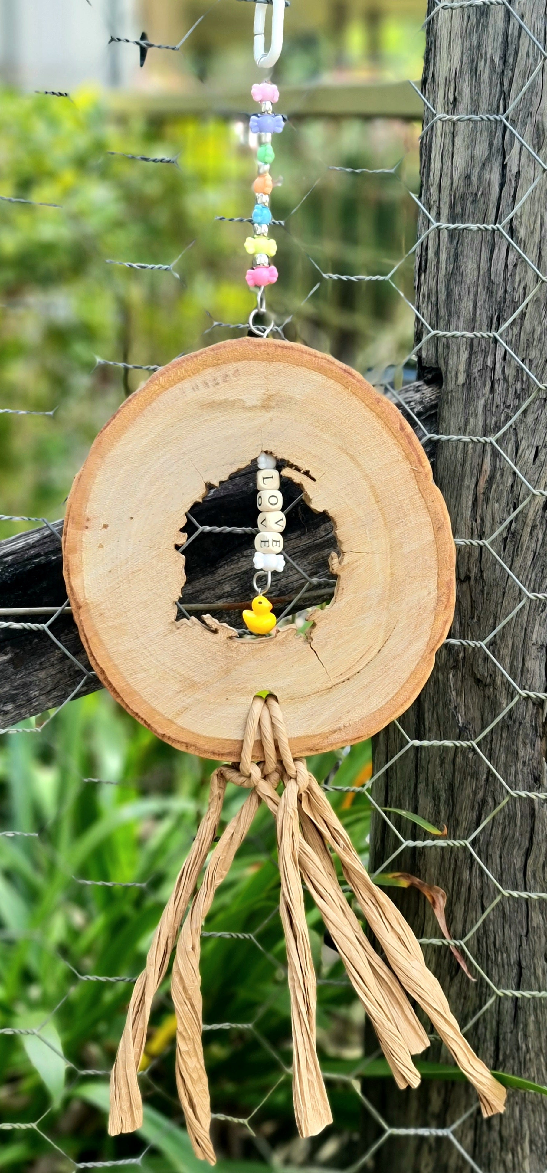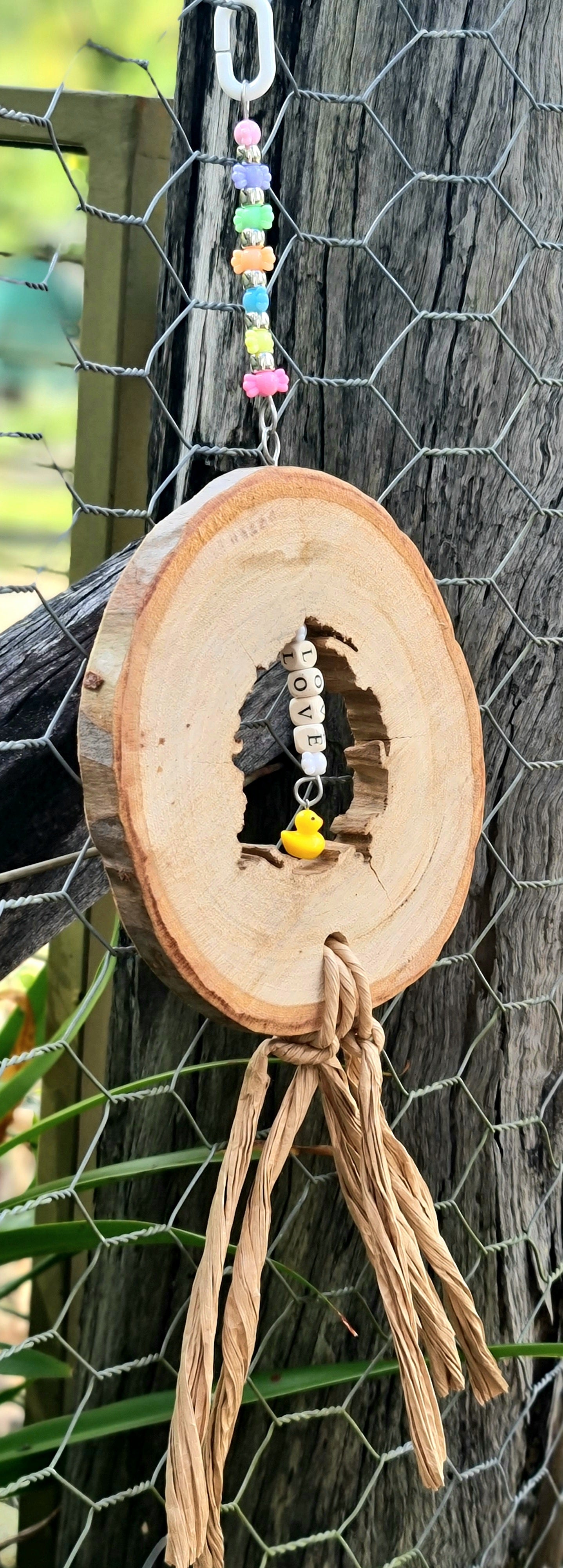 This spotted gum candy ring has a large chewing component all put together using stainless steel wire with the wooden word LOVE within the center of the spotted gum ring. Hand made using a large slice of wood(spotted gum, approximately 2cm thick), pine wood square beads, stainless steel wire, acrylic beads and a plastic clip as the hanger. Width measures approximately 18cm and the overall measurement from hanger clip to the paper base is approximately 55cm long. 🦜🐦 Suits small, medium and large birdies 🤩 Please note that your timber toy may start splitting/cracking/shrinking in areas as it continues to dry out since it has been freshly harvested from our forest, however this should not affect your birdies play time and fun with this toy 😁