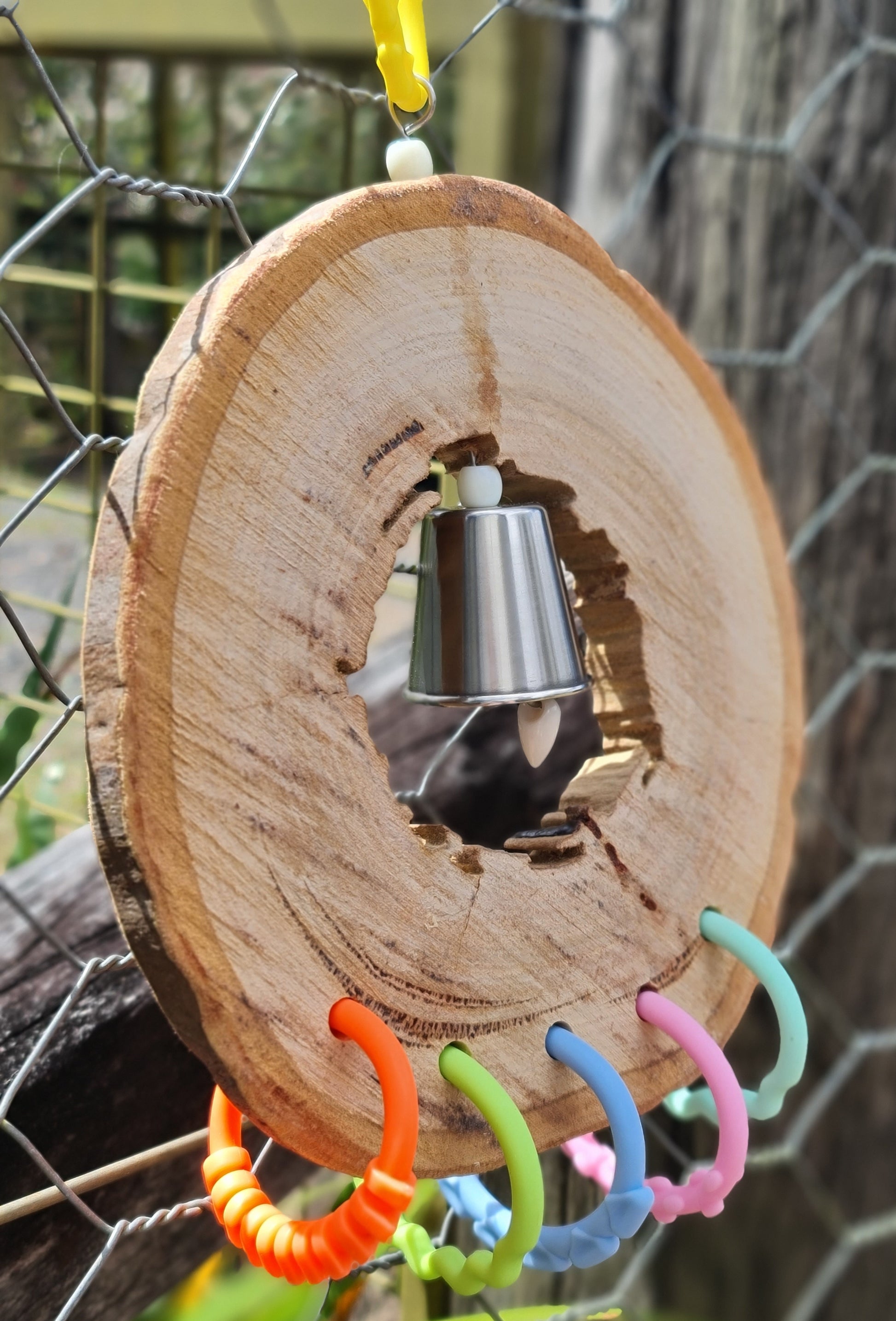 This spotted gum candy ring has a large chewing component all put together using stainless steel wire with the addition of a stainless steel bell within the center of the spotted gum ring. Hand made using a large slice of wood(spotted gum), stainless steel bell, stainless steel wire, acrylic beads/rings and a plastic clip as the hanger. Width measures approximately 18cm, wood slice is approximately 2cm thick and the overall measurement from hanger clip to the acrylic rings base is approximately 30cm long. 🦜🐦 Suits small, medium and large birdies 🤩 Please note that your timber toy may start splitting/cracking/shrinking in areas as it continues to dry out since it has been freshly harvested from our forest, however this should not affect your birdies play time and fun with this toy 😁
