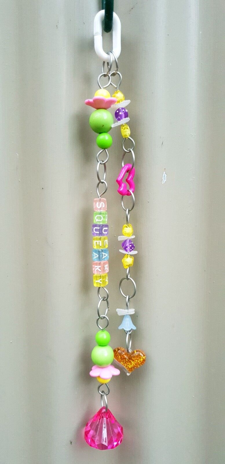 A cute and colourful hanging toy 'Squeaky' Worded toy is hand made from acrylic beads and using stainless steel wire. Measures approximately 33cm long (from hanger clip to base of acrylic crystal) 🐦🦜Suitable for very small to medium birds, can be suitable for large birds if they aren't destructive.