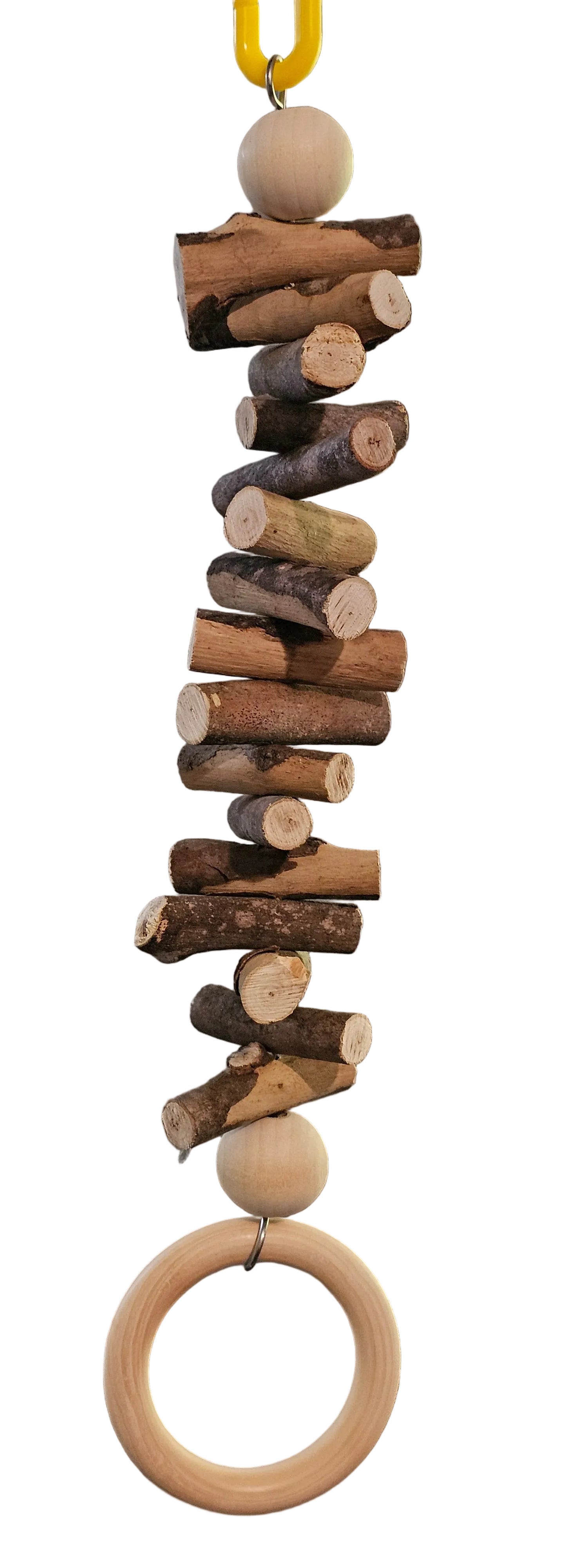 Not 16 candles! this is 16 sticks on our Sticky Bits toy 🥳 Simple but chewy fun for the best feather friend in your life. Sticky Bits toy has 16 spotted gum sticks and also has 2 wooden balls top and bottom and a wooden ring for extra play. 😁🦜🐦 all this is threaded onto stainless steel wire and hang from a plastic clip.