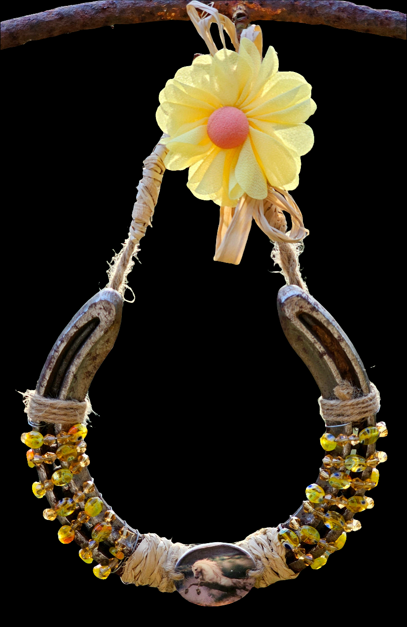 Bring a touch of sunshine ☀️ and good fortune into your home with this handmade rustic horseshoe wall hanging, Sunshine and Luck. Featuring a soft yellow chiffon daisy 🌼, hand-wrapped sparkling light amber quartz crystal beads and yellow flat oval millefiori glass beads, a beautiful shell horse embellishment, all put together on a reclaimed iron horseshoe wrapped in natural twine enhancing it's earthy natural appeal, and hung with a plated raffia hanger loop, this piece radiates warmth, cheer, and positivity 💛