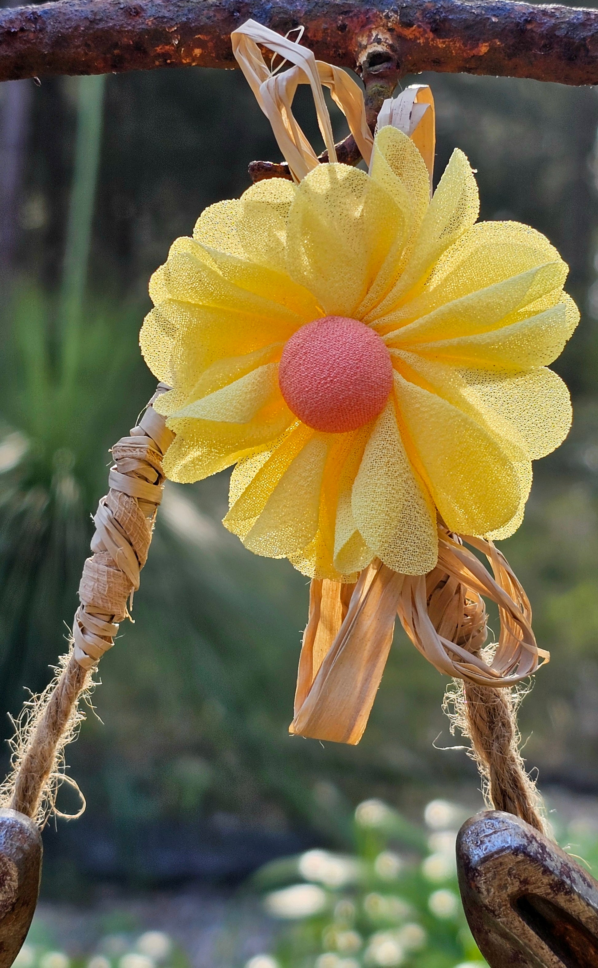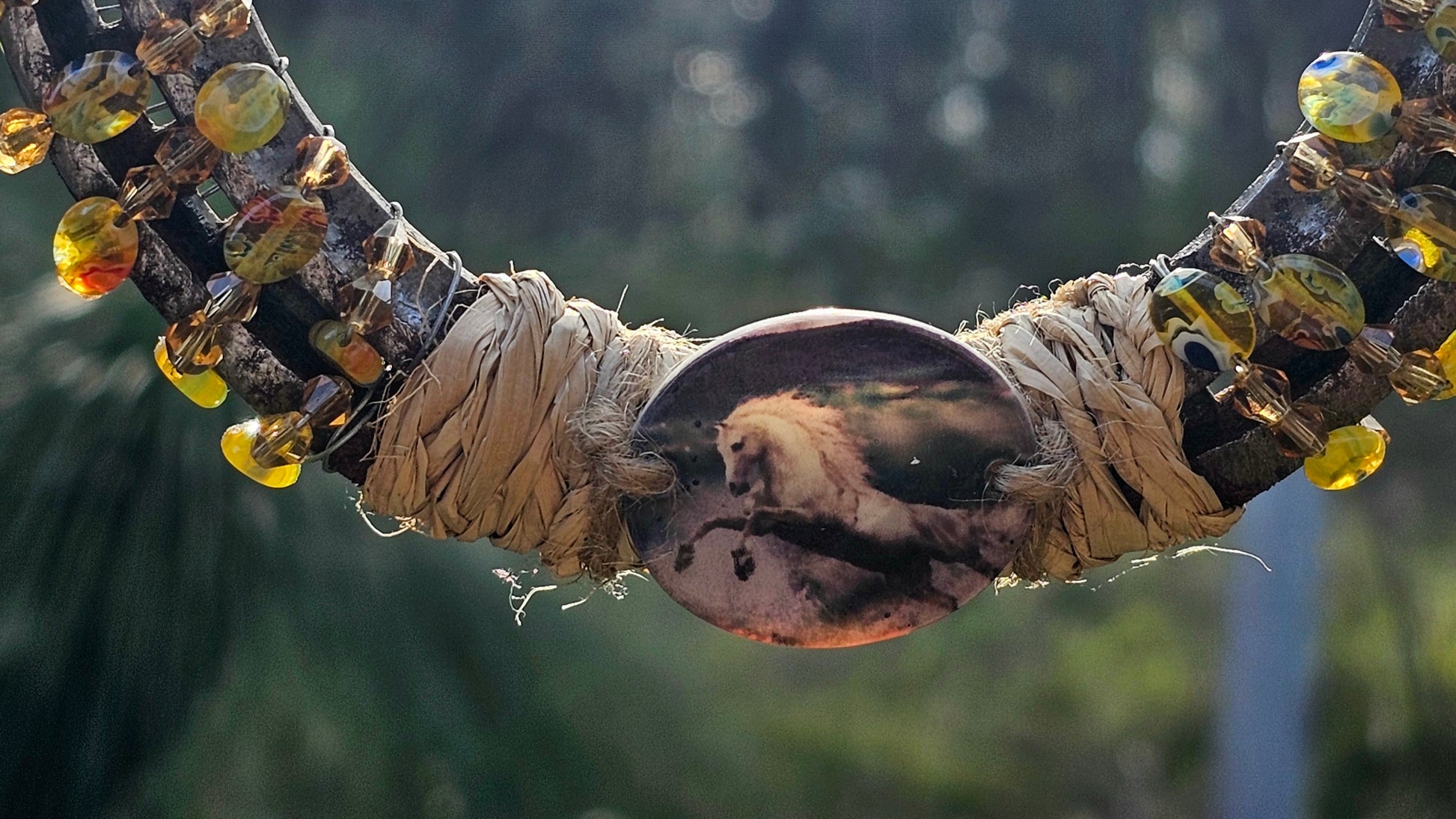 ✨️ Yellow daisy, amber quartz and yellow glass beads, rustic twine wrapping, unique feature horse shell embellishment