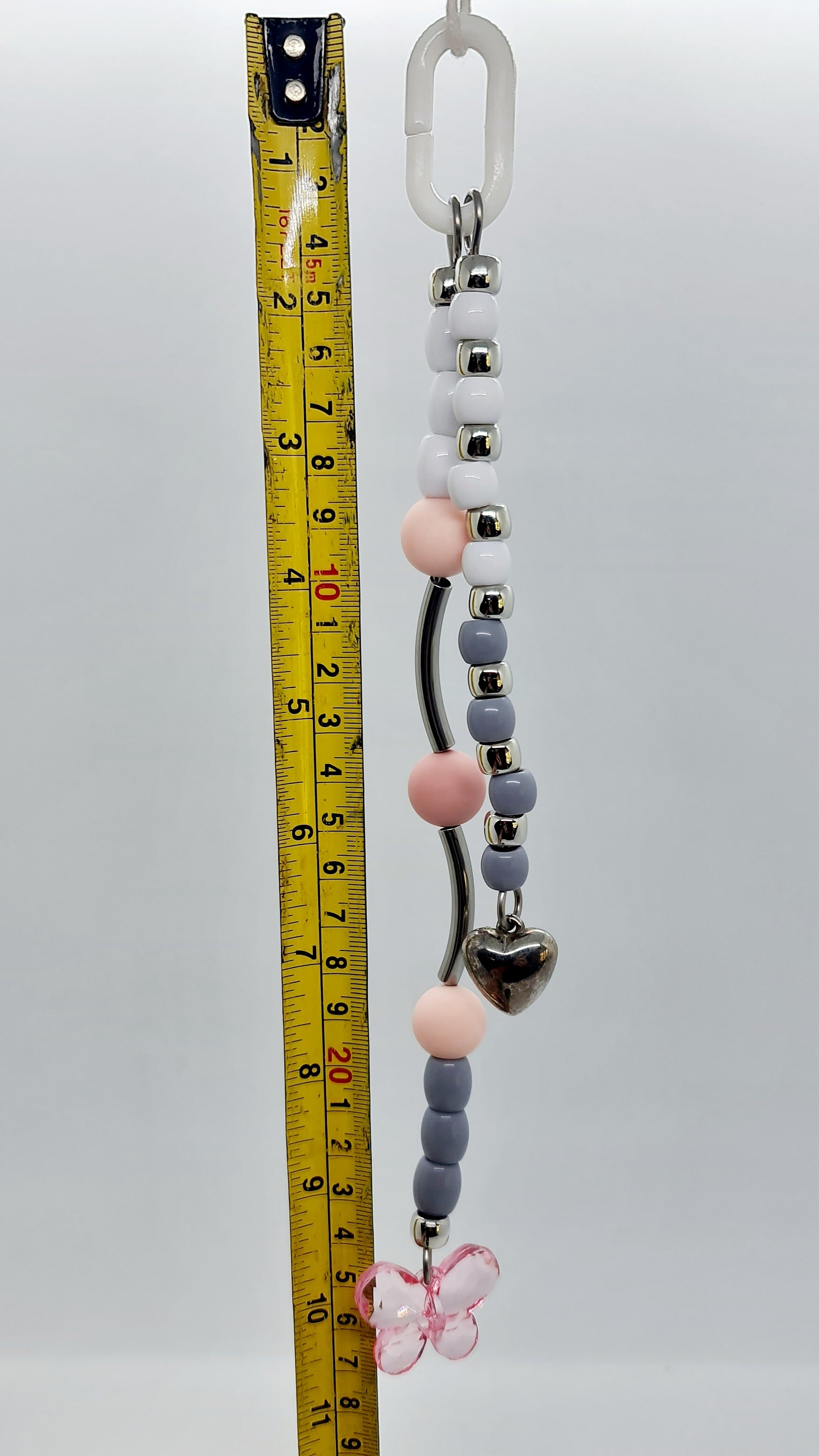 A very pretty and unique piece to add to your birdies palace with it's cool wavy stainless steel beaded tubes, this super shiny silver/grey/white/pink double strand toy is hand made using acrylic beads, stainless steel tubes and stainless steel wire. The overall measurement from hanger clip to the base of the acrylic butterfly is approximately 27cm long. 🦜🐦 Suitable for very small, small and medium birds.