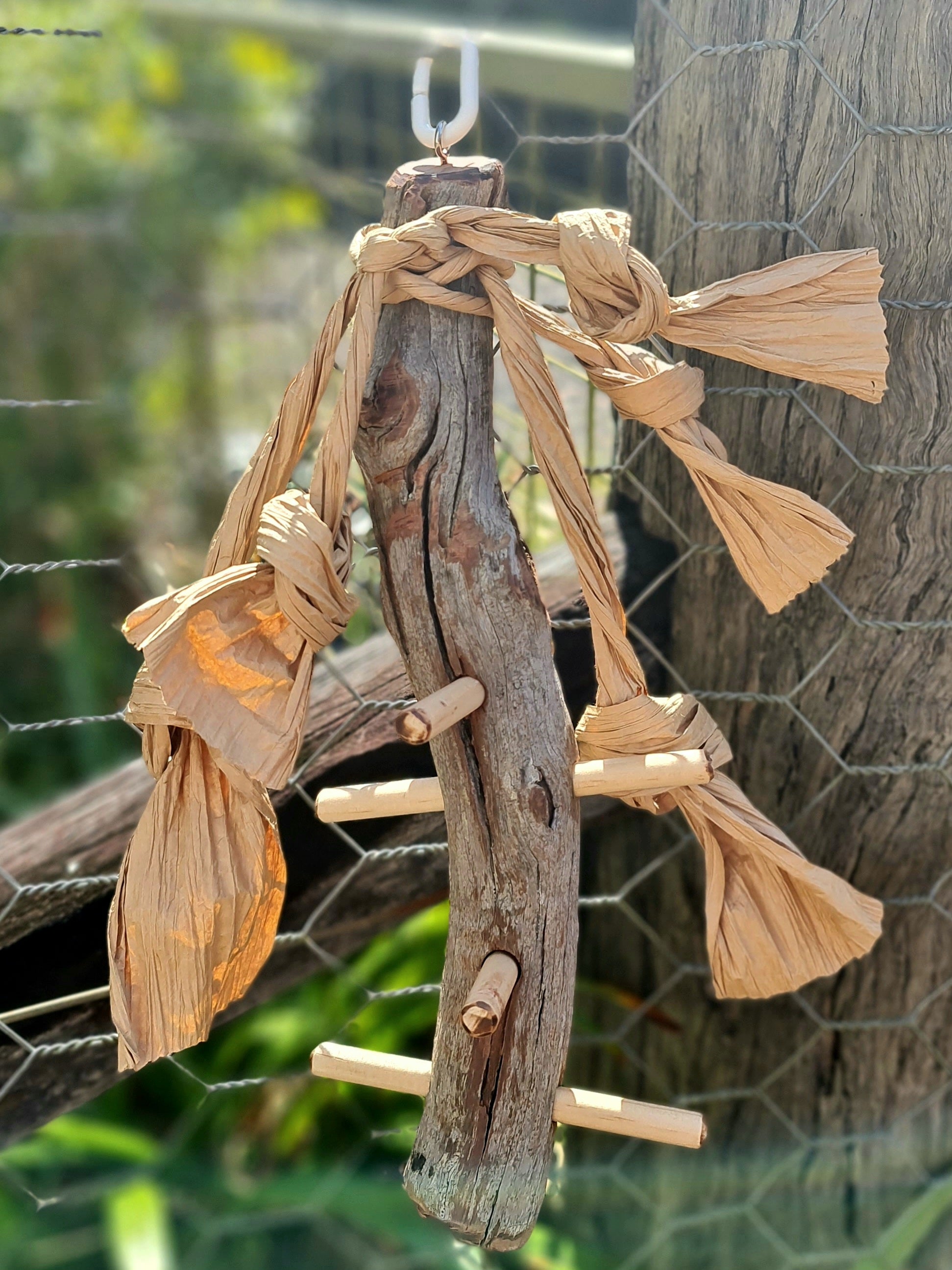 This super shredder toy is created using our very own ironbark from our forest. Hand made using ironbark, pine dowel, paper and a plastic clip as the hanger. The overall measurement from hanger clip to the timber base is approximately 34cm long. 🦜🐦 Suits medium to very large birdies 🤩 Please note that your timber toy may start splitting/cracking/shrinking in areas as it continues to dry out since it has been freshly harvested from our forest, however this should not affect your birdies play time and fun with this toy 😁
