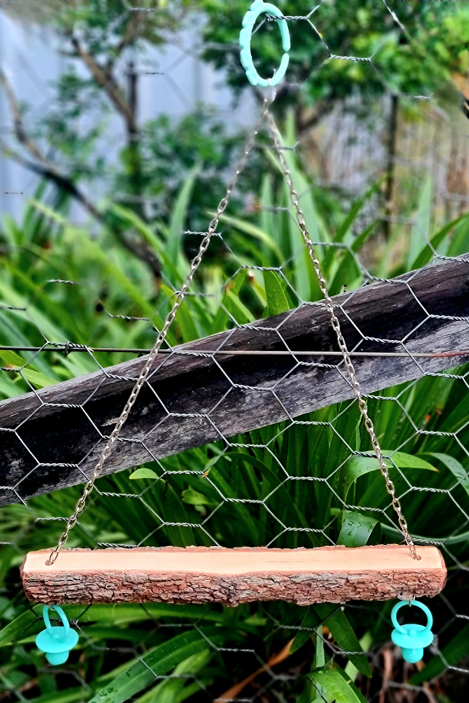 The Friendship Swing is a super cute and fun swing with plenty of room for friends. Hand made with an acrylic hanger and pacifiers, nickel plate chain and casuarina log. Measures approximately 48cm long (from hanger to the base of the swing), length of swing interior is approximately 35cm with a width of 4.5cm.🐦🦜 Suitable for very small, small and medium birds.