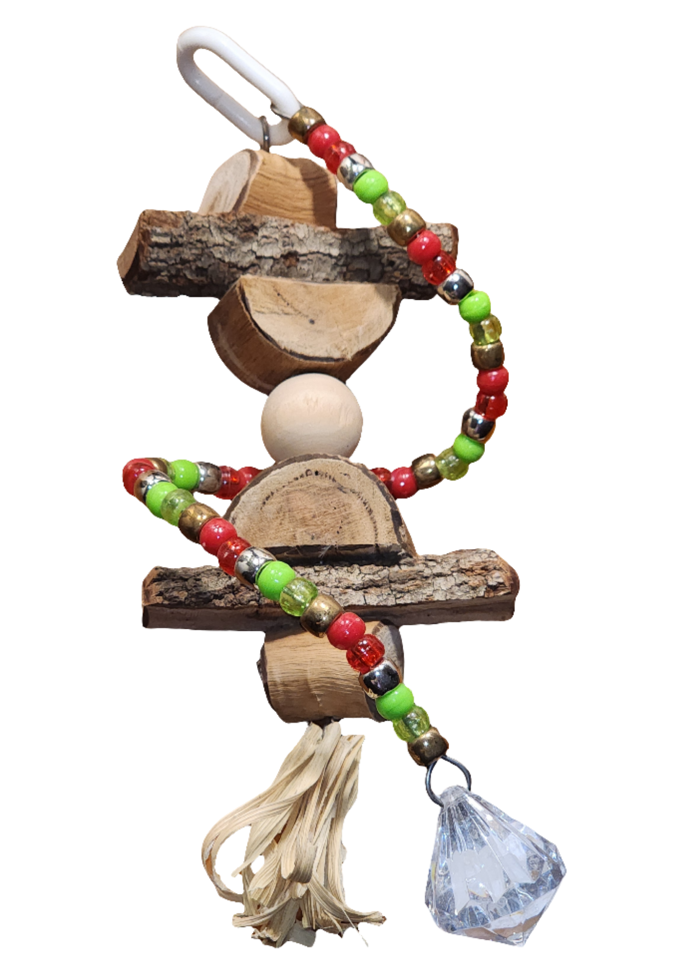 Crafted from timber and colorful acrylic beads, the Christmas bird toy provides shreddable fun for small to medium-sized birds. The festive spiral design features red, green, gold, and silver beads. Measures approximately 24cm from hanger clip to base of toy. 🐦🦜