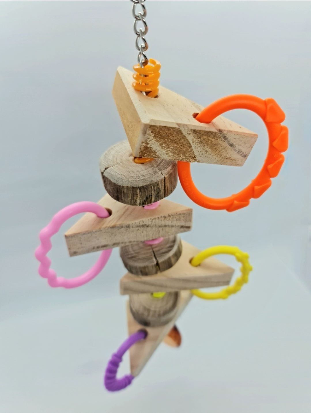 A super fun and very moveable toy for your birdie to shred and play with, the timber shapes and links chain toy has been hand made using acrylic beads, pancake sliced timber(spotted gum), pine wood triangles, nickel plate chain and a plastic clip as the hanger. The overall measurement from hanger clip to the acrylic crystals base is approximately 33cm long. 🦜🐦 Suits very small, small and medium birdies or large non destructive birds (an example is an Eclectus I have is very gentle with his toys)