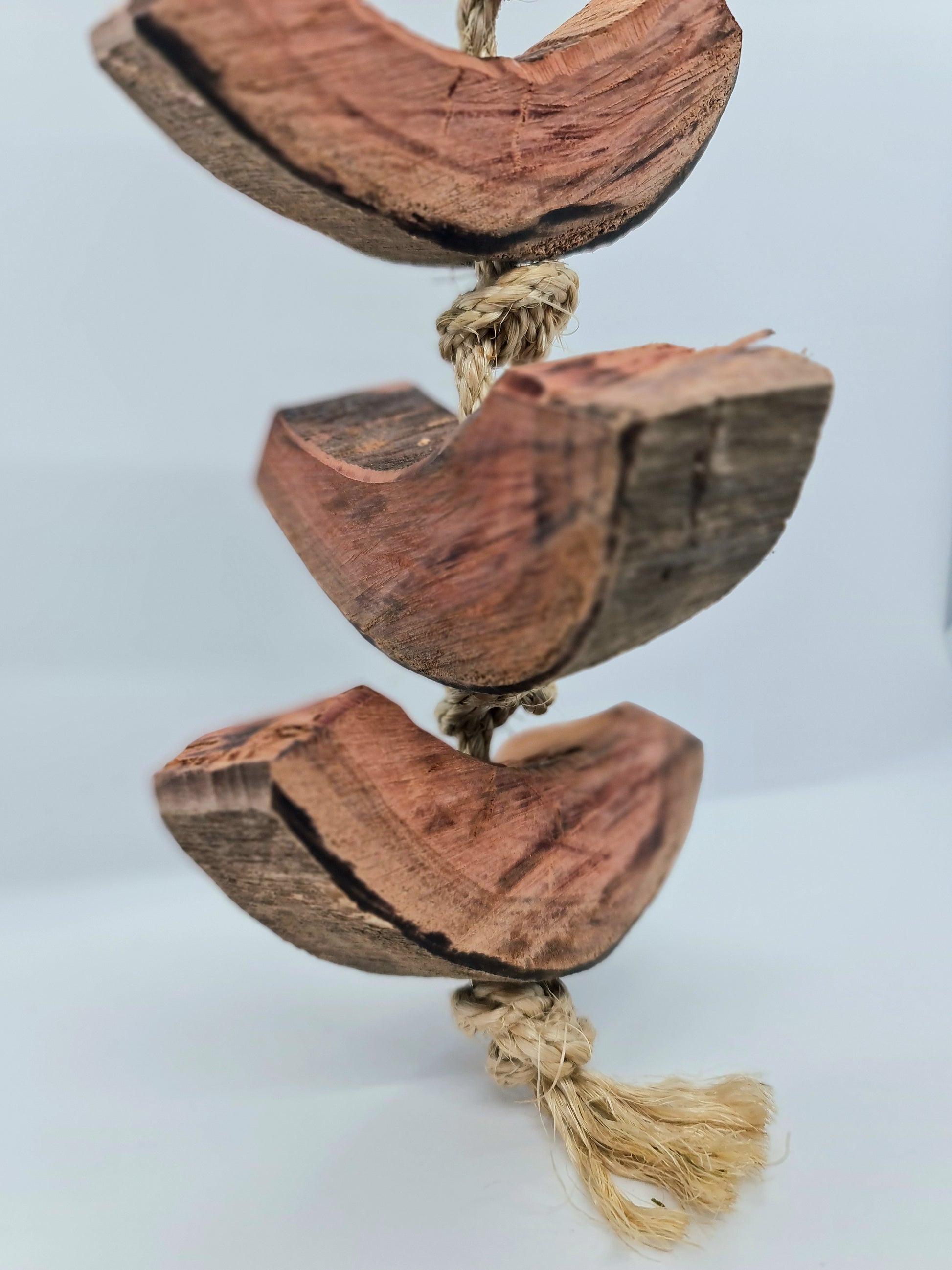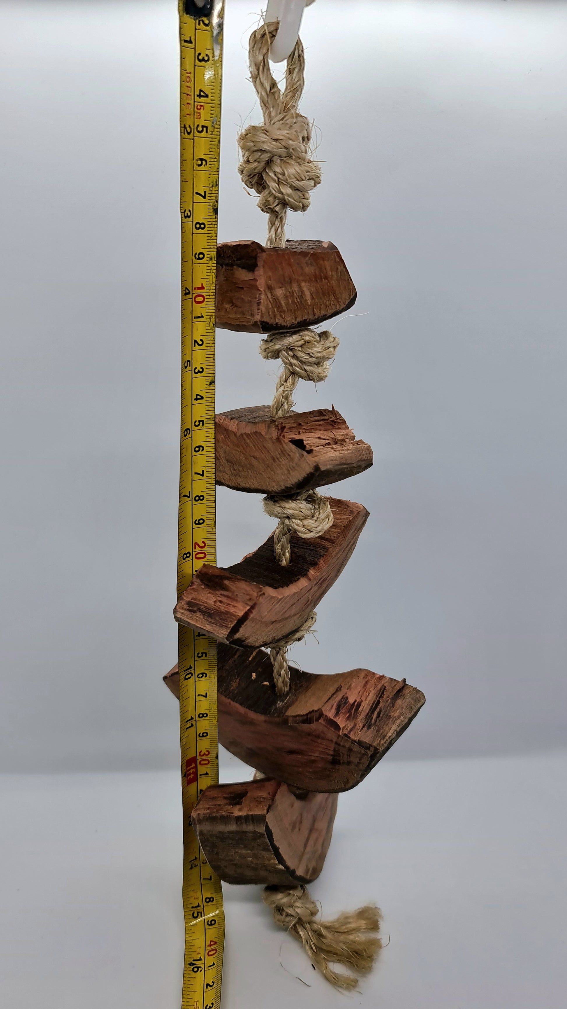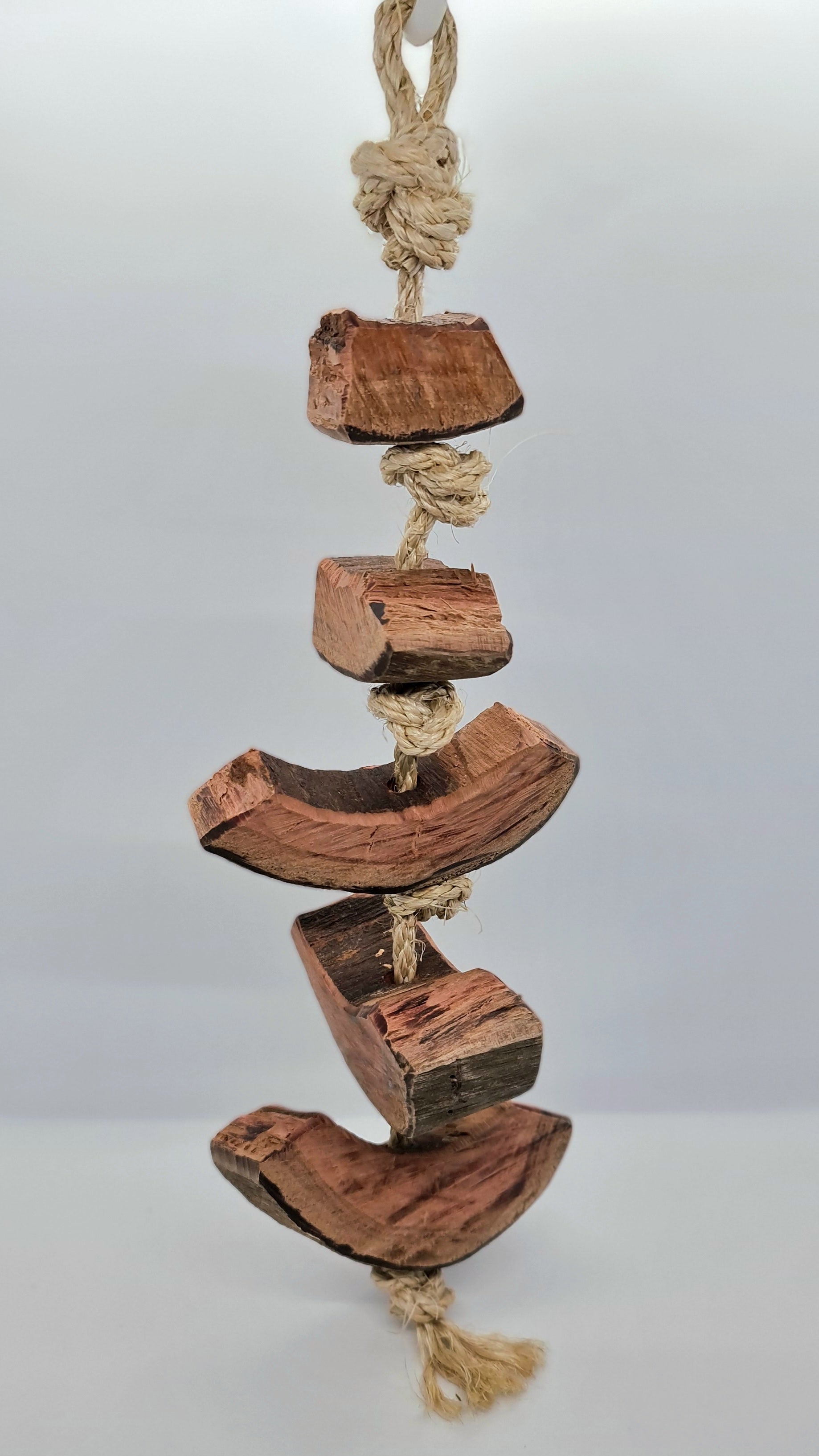 This shredder timber tier forest shreddable toy has been created using timber from our stringy bark trees that have been cut into cute little shapes then threaded onto sisal rope for fun moveability. Hand made using timber, sisal rope and a plastic clip as the hanger. The overall measurement from hanger clip to the rope base is approximately 40cm long. 🦜🐦 Suits small, medium and large birdies 🤩 Please note that your timber toy may start splitting/cracking/shrinking in areas as it continues to dry out since it has been freshly harvested from our forest, however this should not affect your birdies play time and fun with this toy 😁