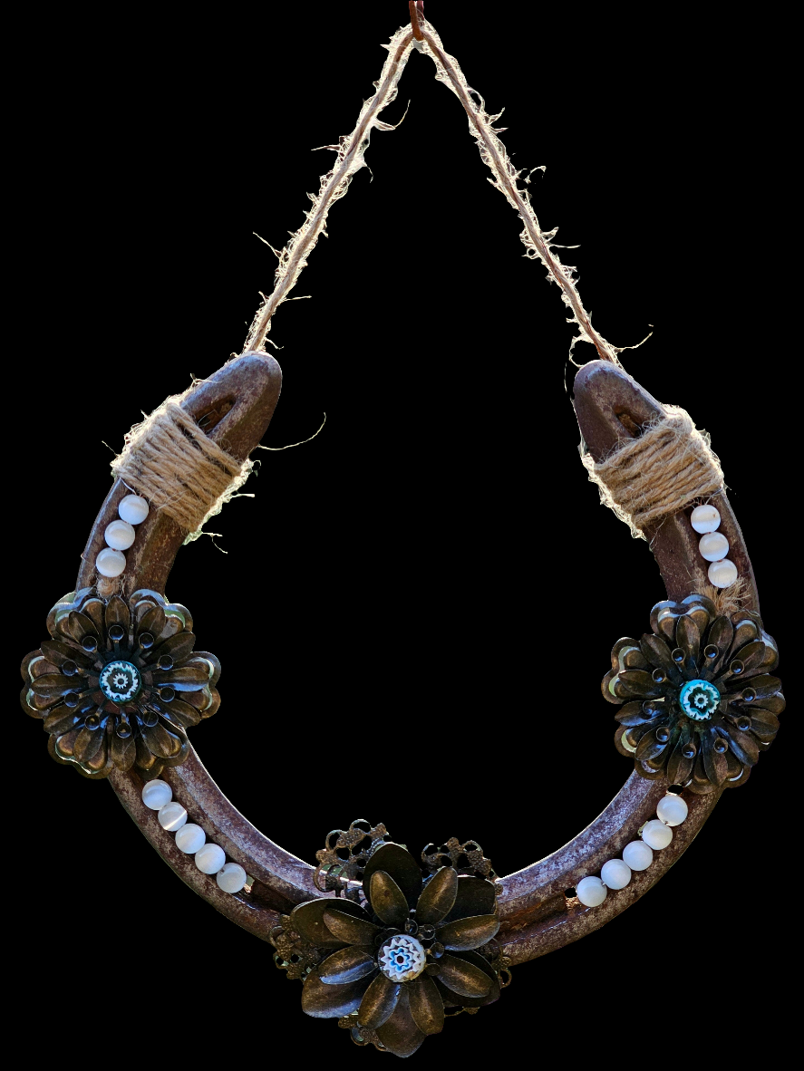 Symbolizing good fortune and protection, this upcycled horseshoe is both meaningful and eye-catching. The floral metalwork evokes strength and resilience, while the beaded detailing adds a soft touch.