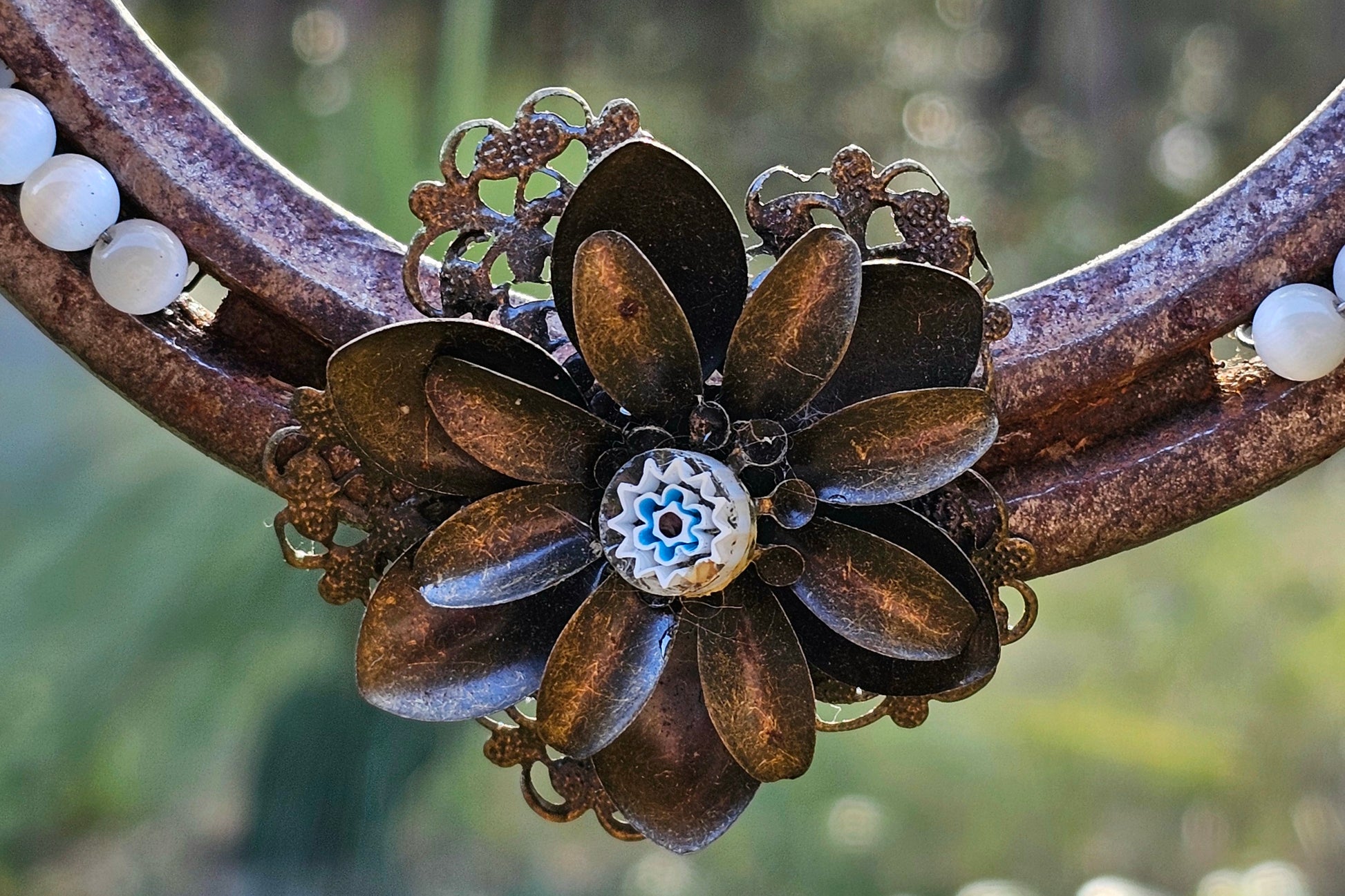 Bring a touch of woodland magic into your home with this one-of-a-kind handmade horseshoe wall hanging. Crafted from a reclaimed iron horseshoe and adorned with intricately layered metal flowers that have millefiori glass bead centers, 16 white glass bead accents, and natural jute twine wrap and hanger, this piece blends rustic charm with a bold, artistic edge.