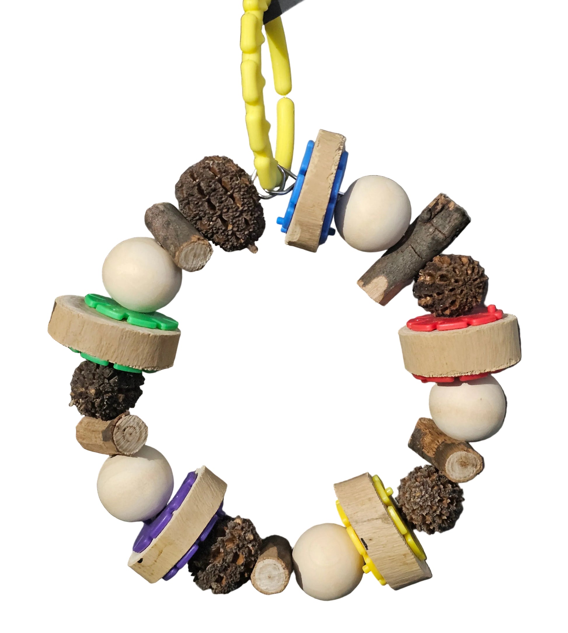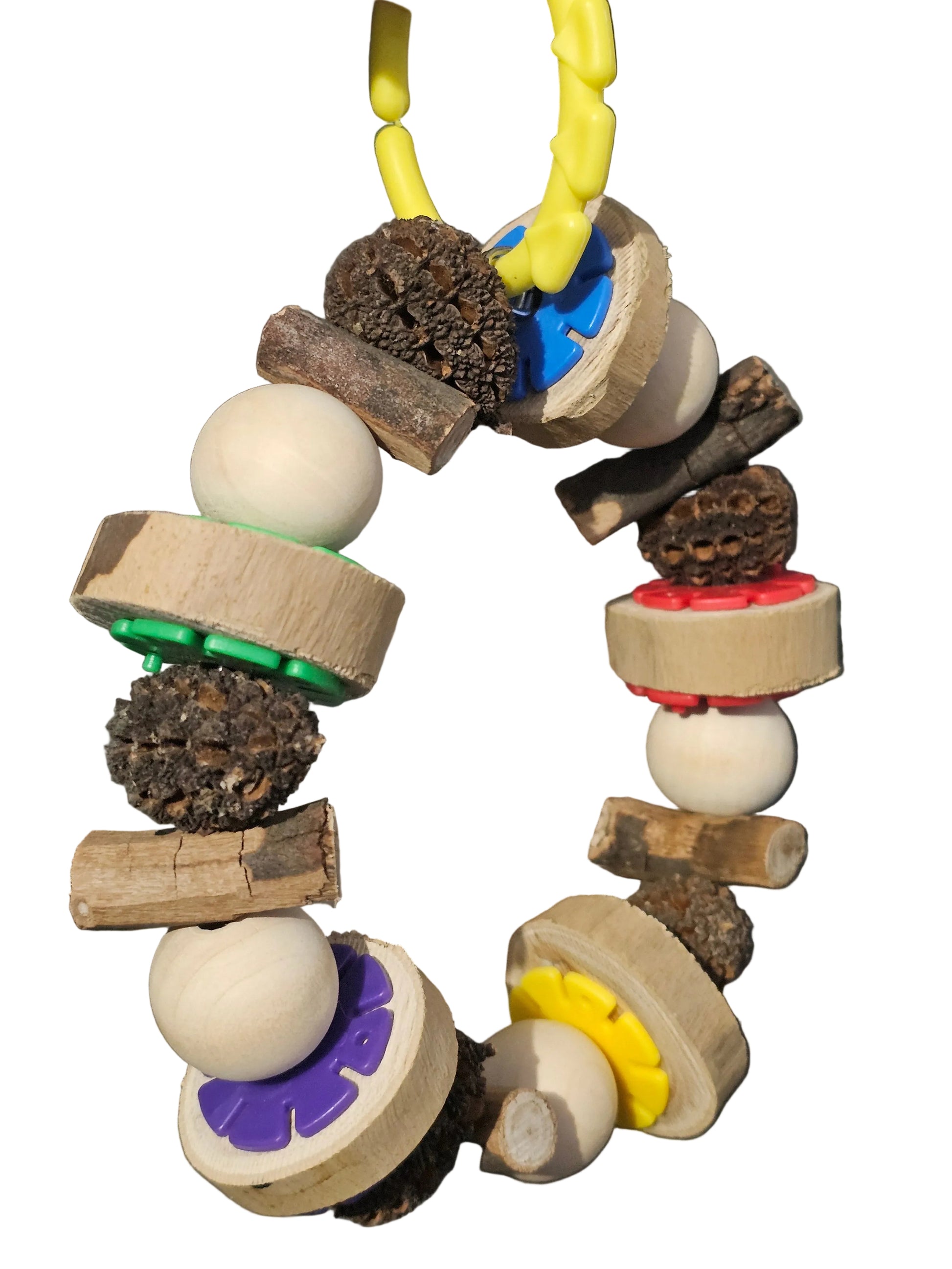 This ring will delight any birdie with it's casuarina nuts, sticks bits, spotted gum discs and colourful plastic flower discs, on stainless steel wire ring and hanging from a yellow link. Fun for anyone 🐦🦜